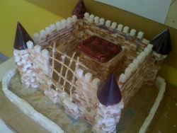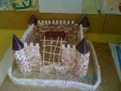 Pour illustrer notre travail sur le moyen-âge nous avons réalisé un château en morceaux de sucre collés entre eux avec de la colle vinylique blanche.