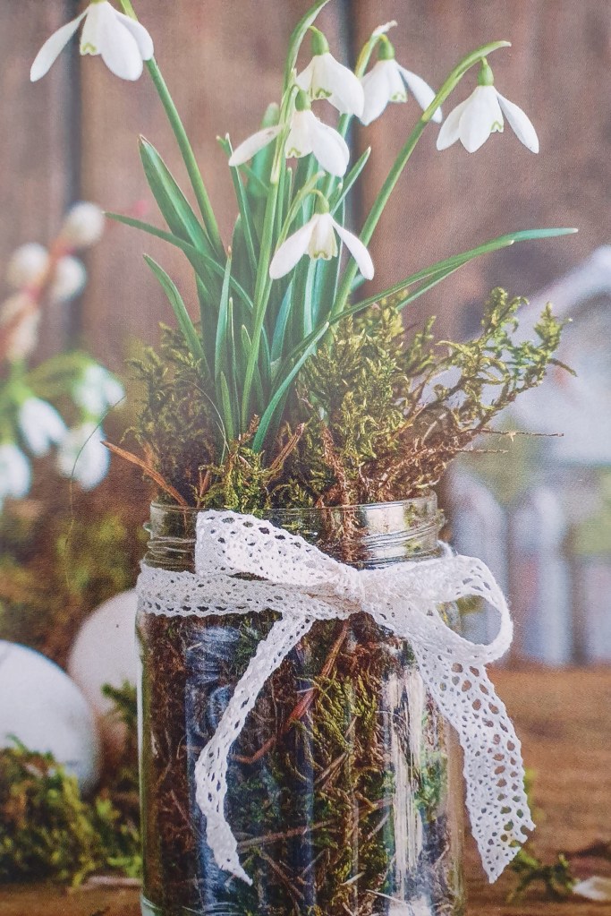 Remplissez un bocal de mousse fraîche et piquez-y des tiges fines de fleurs naturelles ou artificielles de saison (comme les perce-neige). Nouez autour du bocal un ruban festonné ou un brin de chanvre.