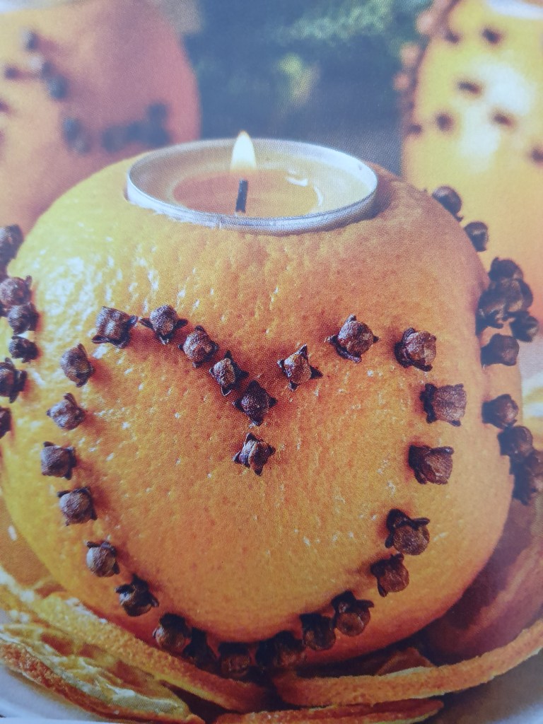 Piquer des clous de girofle dans une orange pas trop mûre en dessinant des coeurs ou des étoiles. Plus on met des clous de girofle, plus le fruit se dessèche et se rétracte. Creuser son sommet pour y insérer une bougie chauffe-plats.