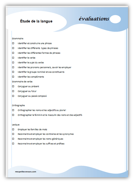 Pour faire le point sur ce que les élèves ont réellement appris et retenu pendant leur année de cm1, ils passent une évaluation de fin d’année qui reprend l’essentiel des notions abordées. La première page est un sommaire des compétences évaluées avec une case à cocher ou à colorier, éventuellement, selon votre mode de fonctionnement.